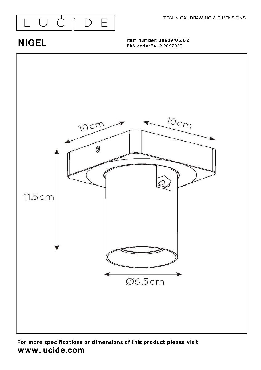 Перечислим технические характеристики спота Lucide Nigel 09929/05/02. Тип цоколя — GU10. Общая мощность лампы — 5 Ватт. Высота люстры — 113 мм. Степень защиты — IP20, что обеспечивает защиту от проникновения предметов размером более 12 мм и защиту от капель воды, падающих под углом более 15 градусов. Спот Lucide Nigel 09929/05/02 — часть коллекции NIGEL. Плафон люстры имеет форму цилиндра и выполнен в Золото цвете.