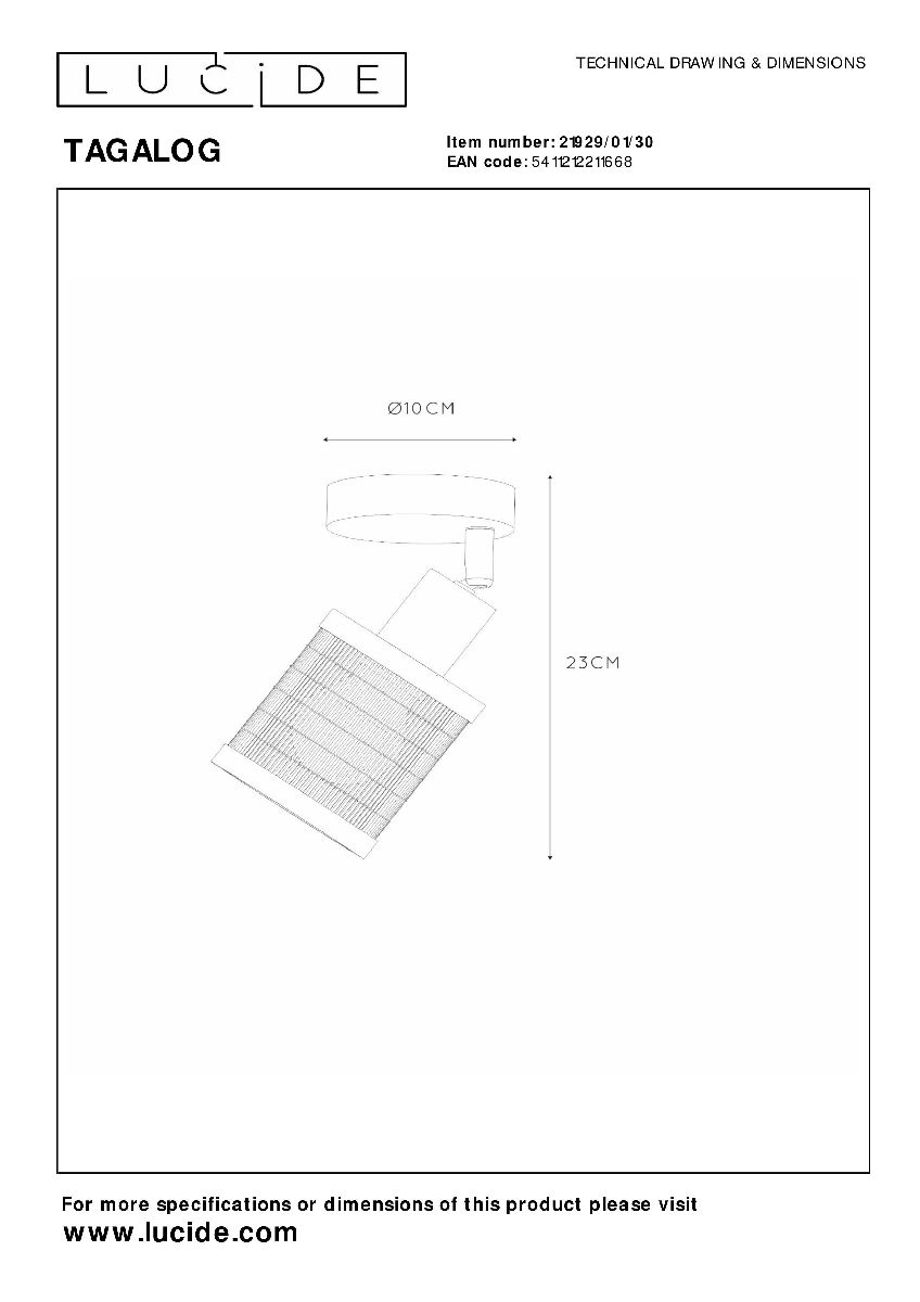 Перечислим технические характеристики спота Lucide Tagalog 21929/01/30. Тип цоколя — E27. Общая мощность лампы — 40 Ватт. Высота люстры — 230 мм. Степень защиты — IP20, что обеспечивает защиту от проникновения предметов размером более 12 мм и защиту от капель воды, падающих под углом более 15 градусов. Спот Lucide Tagalog 21929/01/30 — часть коллекции Tagalog. Плафон люстры имеет форму цилиндра и выполнен в черном цвете.