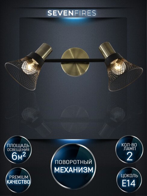 Перечислим технические характеристики спота Seven Fires Gelena SF4708/2W-AB-BK. Тип цоколя — E14. Общая мощность лампы — 120 Ватт. Высота люстры — 190 мм. Степень защиты — IP20, что обеспечивает защиту от проникновения предметов размером более 12 мм и защиту от капель воды, падающих под углом более 15 градусов. Спот Seven Fires Gelena SF4708/2W-AB-BK — часть коллекции Gelena. Плафон люстры имеет форму конуса и выполнен в черном цвете.