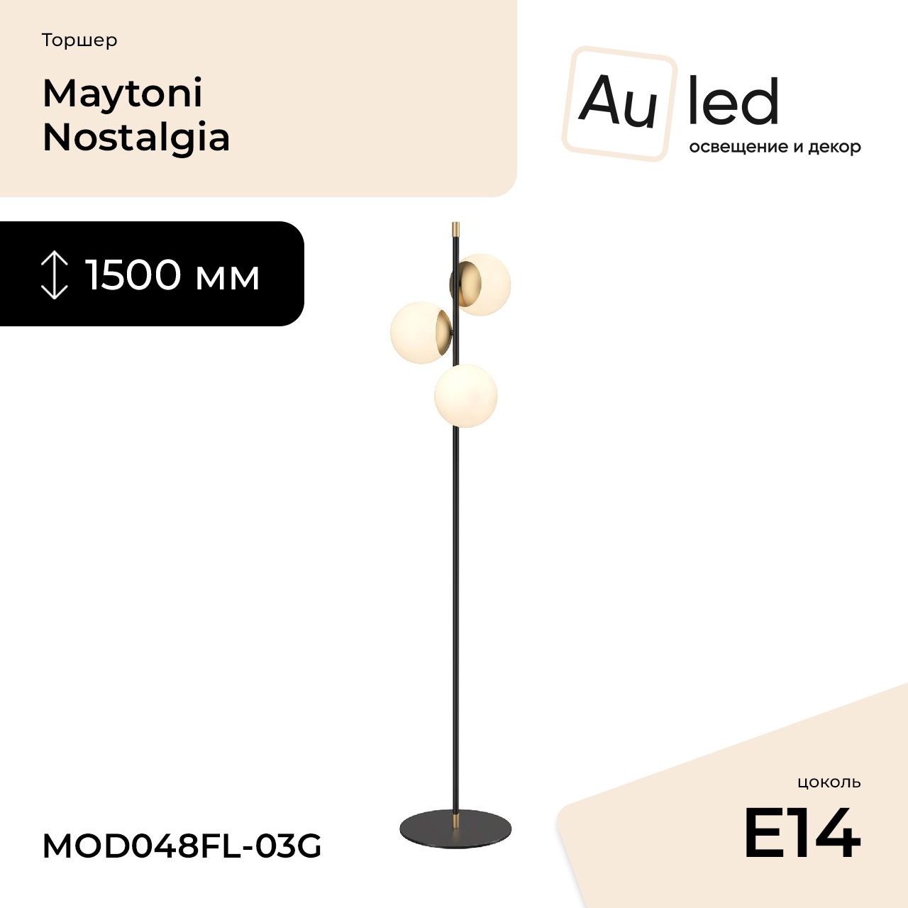 Перечислим технические характеристики торшера Maytoni Nostalgia MOD048FL-03G. Тип цоколя — E14. Общая мощность лампы — 120 Ватт. Высота люстры — 1500 мм. Степень защиты — IP20, что обеспечивает защиту от проникновения предметов размером более 12 мм и защиту от капель воды, падающих под углом более 15 градусов. Торшер Maytoni Nostalgia MOD048FL-03G — часть коллекции Nostalgia. Плафон люстры имеет форму шара и выполнен в белом цвете.