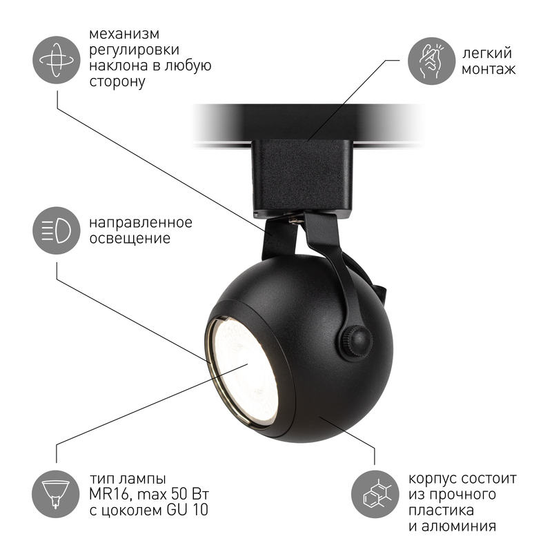 Перечислим технические характеристики трекового светильника Эра TR35-GU10 BK Б0053296. Тип цоколя — GU10. Общая мощность лампы — 15 Ватт. Высота люстры — 130 мм. Степень защиты — IP20, что обеспечивает защиту от проникновения предметов размером более 12 мм и защиту от капель воды, падающих под углом более 15 градусов. Трековый светильник Эра TR35-GU10 BK Б0053296 — часть коллекции TR35. Плафон люстры имеет форму шара и выполнен в черном цвете.